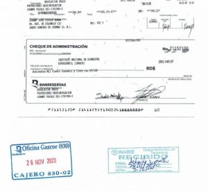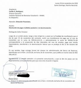 Ante esta situación procedió a entregar mediante cheque de administración del Banco de Reservas al INABIE los pagos irregulares y solicitó a las autoridades competentes la corrección de esta irregularidad administrativa.